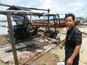 昨天上午11時許,記者與梁先生一同到現(xiàn)場了解情況。梁先生的金江沙場位于定安定城鎮(zhèn)和?谛缕骆(zhèn)交界處,已經(jīng)暫停作業(yè),工人們在工棚休息。記者在采沙船被毀現(xiàn)場看到,采沙船擱淺在岸邊,采沙機器完全被毀,電池燒焦,木板千瘡百孔,表面被大火熏得烏黑,內(nèi)部零件完全破壞。雖然距離案發(fā)已有10余天,當時大火熊熊燃燒的情景依然可以想見。