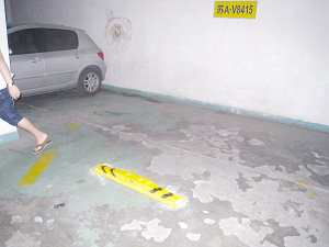 記者隨即來到大廈負(fù)二樓的停車場,一睹機(jī)械車位的芳容!昂眉一,不大的停車場里還真的停放了不少車輛!痹瓉恚瑸榱藢⑼\囄粩(shù)量發(fā)揮到最大極限,這里的停車場充分利用了樓層的空間,借助機(jī)械設(shè)備將停車場分為上下兩層,使停車數(shù)量翻了一倍。那么市民爆料的人防工程停車位在那里呢?記者注意到,在機(jī)械車位的對面地面上還停著不少輛汽車,奇怪的是,每個停車位下面都安裝了地鎖,似乎是防止別的車輛亂停亂放。 就在記者感到納悶的時候,記者抬頭突然發(fā)現(xiàn),在機(jī)械車位對面的墻體上有些人防工程的標(biāo)識。