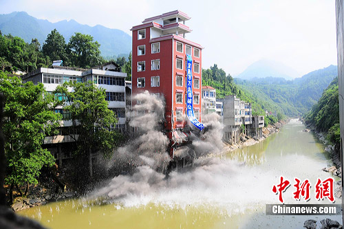 爆破既不能損壞連體的4層樓房,又不能長(zhǎng)時(shí)間堵塞河道,倒塌距離必須嚴(yán)格控制在20米以內(nèi),技術(shù)要求高。工程施工方采取定向爆破和原地爆破兩種方式同時(shí)進(jìn)行,安裝了60公斤炸藥對(duì)房屋實(shí)施爆破拆除,此次爆破非常成功,被網(wǎng)友稱為“最!钡暮又羞`章建筑終于強(qiáng)拆。