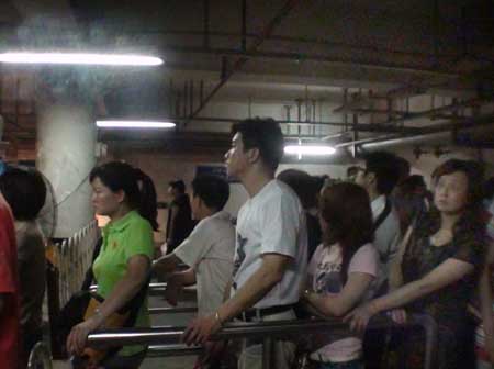 7月29日晚9點多,記者進(jìn)入火車站出站口,沿著指示牌上的“的士候客點”,隨人流一起來到地下停車場昏暗高溫的地下停車場里乘客們個個汗流浹背 排著,長隊等候出租車。奇怪的是,偌大的停車場內(nèi),看不到一輛出租車。
