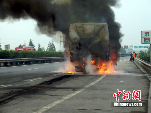 中新網德陽8月9日電 (王超) 9日下午15時50分左右,一輛寧夏牌照的大貨車在行駛至四川成都—綿陽高速德陽黃許鎮(zhèn)路段時,車身突然起火,導致車上裝載的20余噸硝硝酸銨(化肥)猛烈燃燒,濃煙彌漫,隨時都有爆炸危險,高速公路交通一度中斷。經過德陽消防官兵緊張?zhí)幹茫K將險情排除,此次受阻2個多小時的交通隨后慢慢恢復。