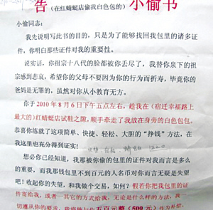 小陳在《告小偷書(shū)》中寫(xiě)到:“假若你把我包里的證件寄給我,或者以其他的方式給我,無(wú)論是什么樣的方法,我一切遵從你的要求,我將施與你500元作為補(bǔ)償。因?yàn)槲沂敲麑W(xué)生,無(wú)更多的經(jīng)濟(jì)能力!衷心希望與你私下和解此事!”