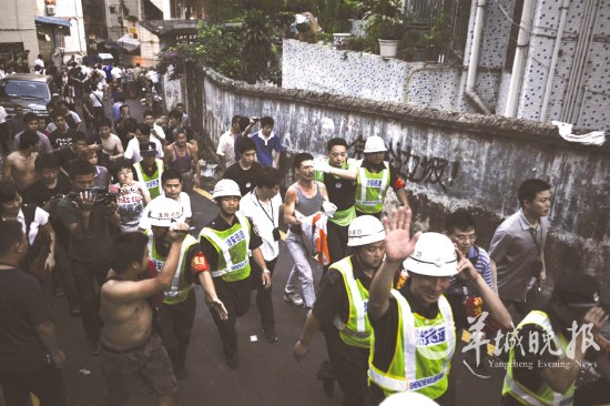 昨日下午2時(shí),羊城晚報(bào)記者接到報(bào)料迅速趕往現(xiàn)場(chǎng)見(jiàn)到,圍觀的人群布滿在各個(gè)警戒線的周圍,現(xiàn)場(chǎng)停了十幾輛警車和消防車,數(shù)十名警察和消防人員聚集在樓下商量對(duì)策。