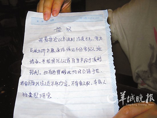 過(guò)了半個(gè)小時(shí)之后,施某提出要吃東西!八呀(jīng)三天沒(méi)有吃東西,三天來(lái)他從沒(méi)下過(guò)樓,想起來(lái)我就心疼!庇谑鞘惣严聵琴I了兩個(gè)盒飯帶上去了!霸谶@段時(shí)間,我勸他:警察殺你很簡(jiǎn)單,為什么不投案自首呢?如果自首他們會(huì)保證你的安全,如果你不放心,我們可以和他們簽一份協(xié)議!笔惣严蛴浾叱鍪井(dāng)時(shí)協(xié)議的草稿,據(jù)施麗佳稱,協(xié)議的主要內(nèi)容為施某投案自首,警察保證他的安全,并根據(jù)自守的情節(jié)向法院求情。