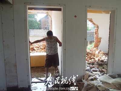 記者在現(xiàn)場看到,這幢樓房里一片空蕩蕩的,多數(shù)人家已經(jīng)搬走。不少住戶的門窗全部被拆掉,部分圍墻被推倒。東邊的山墻,被砸出兩個(gè)大比門窗面積還大的 “洞口”。走進(jìn)樓梯口,記者發(fā)現(xiàn),部分樓梯已經(jīng)被切割掉,多層樓板的水泥被砸掉,裸露出一塊塊鋼筋網(wǎng)。儼然,這幢樓房已經(jīng)成一座危樓。