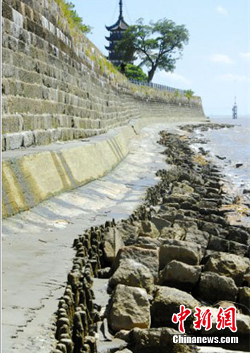 老鹽倉(cāng)丁字壩是觀看錢塘江回頭潮的寶地,但是隨著錢塘江水位下降,丁字壩竟露出了一米多的堤塘。浙江海寧鹽官觀潮景區(qū)管委會(huì)副主任張冰瑜告訴記者,水位已經(jīng)達(dá)到了十年來(lái)最低。