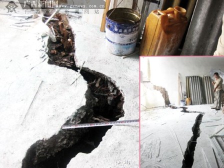 位于南寧市二塘大盤嶺的南寧新城福利五金總廠,因受這兩天大雨的肆虐,使得該廠建材車間地板突然開裂,出現(xiàn)了一條從車間的圍墻裂起一直延伸至地面80多米長(zhǎng)、有些地方寬約60厘米的大裂縫,使人看得觸目驚心。
