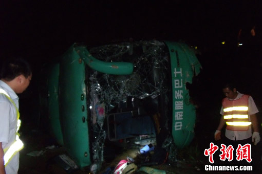 中新社惠州10月2日電(宋秀杰 嚴初 馬云霞)10月1日深夜,一輛深圳牌粵B57270大巴車在惠鹽高速惠州新墟段發(fā)生側(cè)翻。截至2日早6時,已確定車上40余名乘客不同程度受傷,其中6人重傷,1人搶救無效死亡。