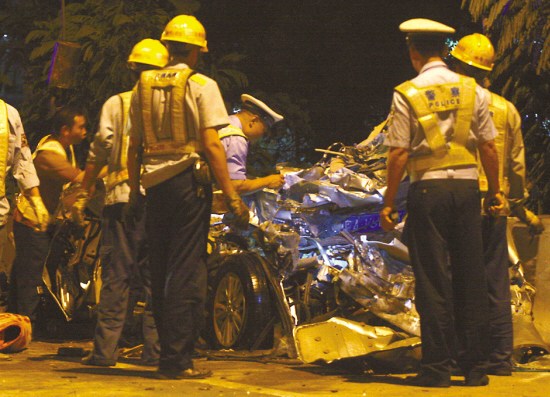 羊城晚報(bào)記者昨晚9時(shí)許來到北二環(huán)高速米龍大橋路段,只見東往西方向車道上,停滿了救援車輛,大批交警、消防員和救援人員在緊張工作中。記者看到,在出事的米龍大橋路肩上,停著兩輛大貨車、一輛黑色小轎車和一輛綠色面包車。大約在9時(shí)30分,救援人員從已被撞成廢鐵的黑色小轎車中救出一名男子和一名女子,兩人看上去均年約20多歲?上,經(jīng)現(xiàn)場(chǎng)救護(hù)人員診斷,兩人已當(dāng)場(chǎng)死亡。