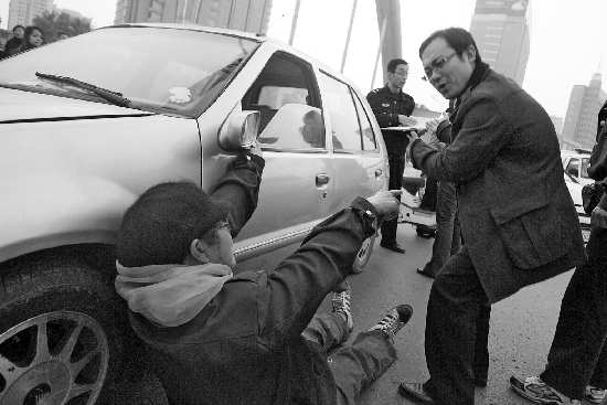 一對(duì)情侶目睹了事情的整個(gè)過程,“人家抓住車窗,司機(jī)就不應(yīng)該再啟動(dòng)汽車!碧幚磉@件事情的交警牛根榮說,先把傷者送到醫(yī)院,雙方可以協(xié)商解決這件事情。(記者趙磊)