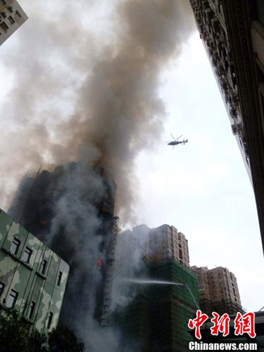 在火災現(xiàn)場,記者看到,起火高樓外表已被燒黑,現(xiàn)場火勢洶洶,濃煙滾滾;附近道路地面上覆蓋了大量灰燼,水流滿地;周邊方圓數(shù)百米內充滿了煙霧和刺鼻的氣味;來自交警方面的信息稱,失火大樓周圍數(shù)條道路已被封鎖。記者看到,不僅消防車緊急出動,警用直升飛機也參與高樓救援。