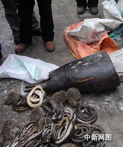 中新網(wǎng)吉林1月3日電(蒼雁)近千條野生錦蛇,一只海豚頭和刺猬在吉林市場被叫賣,1月3日,吉林市林業(yè)局稽查支隊(duì)查獲了這些在冬天里被捕殺的珍貴野生動(dòng)物。