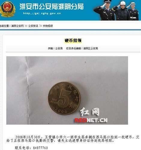 這則5毛錢(qián)招領(lǐng)告示系江蘇省淮安市淮陰公安分局所發(fā)。啟示稱,“王營(yíng)鎮(zhèn)小學(xué)六一班學(xué)生蔡卓樾在西馬路口撿到一枚硬幣,交給了正在西馬路口執(zhí)勤的交警,請(qǐng)失主迅速帶身份證件到我局領(lǐng)取”。啟示上還附有照片,一枚銹跡斑斑的5毛錢(qián)硬幣,靜靜躺在照片里。據(jù)悉,這是他們根據(jù)上級(jí)的要求,作為政府信息公開(kāi)的具體實(shí)施步驟,通過(guò)互聯(lián)網(wǎng)發(fā)布失物招領(lǐng)信息。記者搜索到5毛錢(qián)硬幣頁(yè)面已被刪除。不過(guò),能通過(guò)“快照”看到。