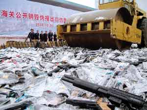 據(jù)了解,這批仿真槍是廣東省海關系統(tǒng)近年來查獲的最大一宗走私仿真槍案。2006年4月5日,深圳市祥鵬達貿(mào)易有限公司以一般貿(mào)易方式向汕頭海關申報出口塑料玩具469箱,共62468個,凈重11032公斤。經(jīng)海關查驗確認,其中的310箱申報為塑料玩具(軟彈槍)的貨物實際為仿真槍43款共42762支,申報貨物與實際不符。經(jīng)鑒定,該批貨物分別與美國產(chǎn)“航空曲尺”、“M9”、“格魯GP-100左輪”等軍用手槍近似;與美國產(chǎn)“MP5K-PDW”、匈牙利產(chǎn)“NGM”等沖鋒槍、步槍近似,均為仿真槍。(本報記者 楊媛 通訊員 岱芬 純潔 曉潔 攝影報道)