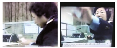 左圖:女售票員手拿多票,卻不對(duì)外發(fā)售。右圖:發(fā)現(xiàn)有人拍攝,女售票員拉下?lián)鹾。本?bào)記者張沫攝于電腦屏幕