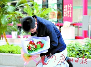 寒風瑟瑟,一年輕男子跪在東莞市南城區(qū)體育路口,從早上9時到下午4時,遲遲不肯起身。他的懷中抱著一束紅色的玫瑰花,他不時用右手撐一下地面,讓自己發(fā)麻的膝蓋放松一下。