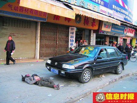 據(jù)停在路口待客的一些“摩的”司機透露,這名男子在此流浪已有五六年時間了,他平日里也不向人乞討,就靠好心人接濟為生,晚上就睡在路邊店鋪門前。當(dāng)時那輛小轎車停在人行道上,車主先是下車去買東西。過了不久,那名流浪漢走到離車頭前幾步遠的地方躺在地上,閉起眼睛曬起“日光浴”,似乎已經(jīng)睡著了。后來轎車司機回來開車,卻沒有注意到車前竟躺著一個人,無情的車輪軋過流浪漢的頭部,他一聲都沒發(fā)出就送了性命。幾個過路人合力將車頭抬起來,發(fā)現(xiàn)他已經(jīng)沒氣了。