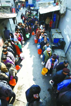 目前,松江當(dāng)?shù)鼐用袂榫w比較平穩(wěn),有序地在送水車或消防龍頭前排隊等候取水。