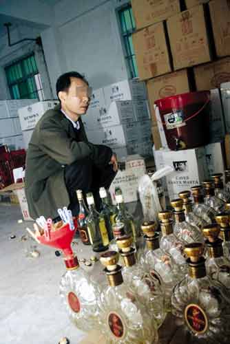 在中山市西區(qū)金葉市場的一個(gè)窩點(diǎn),搜查人員在倉庫中搜出大量假冒洋酒和假冒國產(chǎn)名酒。同時(shí)繳獲的賬本顯示,許多假酒都賣給了市內(nèi)一些酒店和KTV、酒吧等娛樂場所。據(jù)制假的“老板”交代,他們收購廉價(jià)洋酒后,再勾兌色素灌入洋酒瓶,一分鐘就能生產(chǎn)一瓶“洋酒”。冒牌國產(chǎn)“名酒”,也是勾兌廉價(jià)國產(chǎn)白酒做成的。