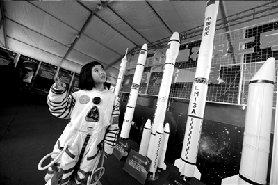 當天下午,設在騰龍閣的航天科技體驗場不斷有三五成群的游人進出,神七返回艙的全尺寸模型、嫦娥一號的實物火箭殘骸、剛剛研制出來的長征五號運載火箭的微縮模型……站在只有在電視上能見得到的航空物品前,小朋友拉著爸爸媽媽問個不停。旁邊,等待試穿宇航服的游客自發(fā)排起隊,準備過把“航天癮”。“神氣吧,快給我拍一張!焙蟻砭﹦展と藛T張淼第一次逛廟會,穿好宇航服后,他立即站到太空照片的背景前拍照留念。