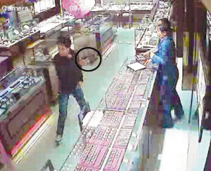 “這人我有印象,他以前來過店里。”反復看了幾遍監(jiān)控錄像后,店長鄭小姐突然說。鄭小姐說,這名黑衣男子去年臘月底曾到過店內,當時他穿的是一身運動裝,同來的還有另一名青年男子,兩人進店后看了兩三個小時,詢問了上10種珠寶首飾的價格,但什么都沒買,她和另一名店員還曾報怨過,所以印象較深。