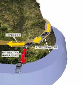 冉某說,出事的地方位于忠縣縣城2公里處,是一條村級土路的長下坡,下完坡后本應(yīng)該右轉(zhuǎn),但轎車沒有轉(zhuǎn)彎,而是直接從彎道沖了下去!肮冯x江面約有100米高,打撈出來的轎車車門是打開的。”冉某說,由于轎車墜江的地方是懸崖,兩人應(yīng)該先是跳出轎車,最終男子掉進了江里,而其侄女則滾到了江邊。