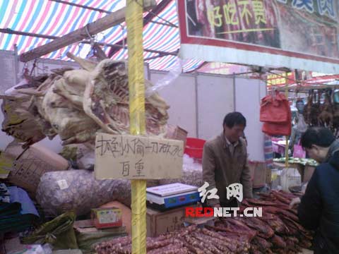 照片顯示:一個(gè)簡(jiǎn)陋的肉類食品攤位,攤位前擺放著臘腸、熏臘肉等肉制品,一名中年男子攤主正和一名顧客進(jìn)行買賣交易,攤位頂上掛著整頭的干豬肉,四周是零亂地堆滿了一些紙制品包裝箱、紅色塑料盆,攤位掛著“好吃不貴”條幅,最為顯眼是支撐攤位的一根本柱上用一塊硬紙板上用毛筆寫著警示牌。