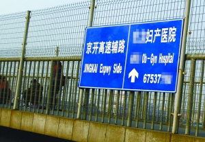 時(shí)先生所指的指路牌有四塊。其中一塊懸掛在新發(fā)地長(zhǎng)途客運(yùn)站門前的過街天橋南側(cè)護(hù)欄上,正下方為進(jìn)京方向輔路。這塊藍(lán)底白字的牌子上,并排印著京開高速輔路和某家婦產(chǎn)醫(yī)院的字樣,旁邊還有相應(yīng)的英文和箭頭指明方向,并留有醫(yī)院電話。