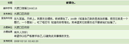 這封來信反映:在大渡口九宮廟天橋上,“我朋友去嫖妓錢被調(diào)包了,損失200塊!眮硇诺哪康氖牵合M驌糍u淫行為,以讓“其他的人不要被他們給騙了!鞭k理該來信的大渡口區(qū)政府回信只有一句話:“希望你以后嚴(yán)格要求自己,以避免此類事情的發(fā)生!