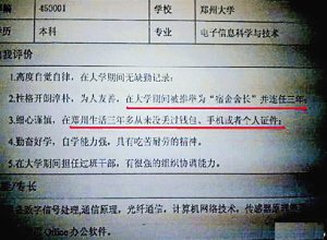 該網(wǎng)友在帖子中展示了她公司最近收到的一份求職簡歷的圖片。圖片顯示,求職的是一名來自鄭州大學(xué)的本科女生,專業(yè)是電子信息科學(xué)與技術(shù)。其中,最“雷人”的一部分在其自我評價一欄:“在大學(xué)期間被推舉為“宿舍舍長”并連任三年;細(xì)心謹(jǐn)慎,在鄭州生活三年多從來沒丟過錢包、手機(jī)或者個人證件!