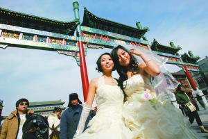 情人節(jié)的中午,兩對盛裝的同性戀情侶在前門步行街拍攝婚紗照,并和其他同性戀朋友一起向路人贈送玫瑰。參與的同性戀情侶稱,希望通過公開拍攝同性結(jié)婚照的形式,推動社會對同性戀群體的關(guān)注和接納。