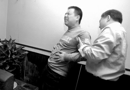 2月21日下午,記者等人在鄭州市金水路的新島咖啡店見到了蔡玉建和他的徒弟釋延力。本報攝影記者陳曉東第一個要求體驗被點穴的感受,釋延力站在一邊,用手背照準陳曉東的右肋下甩了一掌,猛然間,陳曉東臉色大變,呼吸急促,木頭一般地僵在了那里。釋延力迅速用雙掌擊打陳曉東雙肩、后背并讓其彎腰吐氣……少頃,陳曉東臉色恢復(fù)正常!疤珔柡α,被點住后,我整個右半身麻痹疼痛,但被他拍打幾下后,這種癥狀很快就消失了!”陳曉東說。