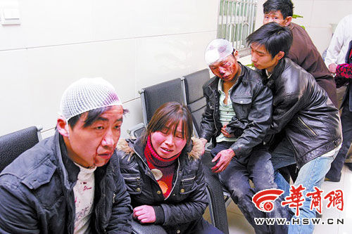 在鳳城醫(yī)院急診科,看見丈夫陳國權(quán)滿臉血跡,頭裹紗布無力地靠在大廳的椅子上,王克云立即失聲痛哭。陳國權(quán)說,頭上剛縫了6針。鐘文榜傷勢更嚴(yán)重,滿臉的血跡已凝結(jié),頭裹紗布,左腿已不聽使喚!八麄儍扇舜蛭乙粋!辩娢陌裾f。自己看見打人的頭戴著紅色的安全帽,上面有“中國華西”幾個字!笆俏(在外面)報的警,他們看見我報警了,追出來把我一陣亂打!币慌缘耐蹩饲暹呎f邊流淚。