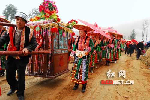 一場譽(yù)為“史上最原生態(tài)的花瑤婚禮”今天(23日)在(湖南邵陽市)隆回縣虎形山瑤族鄉(xiāng)舉行,花傘掛繡球、五子飛棋、攔門酒、對歌、打蹈、打泥巴等花瑤文化元素都在婚禮中得到表現(xiàn)。銅錢坪村的步楚吳說,今年45歲的他已經(jīng)二十年沒見過這么原汁原味的花瑤婚禮了,來自株洲、邵陽等地的網(wǎng)友一起見證了這場婚禮。