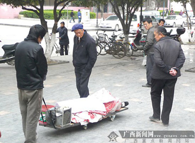 下午3時(shí)30分許,記者趕到靈川縣城。還沒到商貿(mào)城門口,就遇到三三兩兩的市民在議論此事。有人說:“這到底是死人還是活人?昨天就在這里討錢了,要是死人,尸體還不臭嗎?要是活著,怎么連頭也蓋著,還一動(dòng)不動(dòng)的呢?好像去年他們也來過這里討錢的!