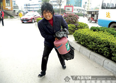 2月25日下午,在靈川縣商貿(mào)城門口,一名男子推著一具包裹得嚴(yán)嚴(yán)實(shí)實(shí)的“尸體”在討錢。當(dāng)記者提出要幫他找有關(guān)部門解決困難時(shí),男子急忙“收攤”,拖著“尸體”離開。記者跟著他們,只見那具“尸體”忽然爬起來,抱著滿滿一桶討來的錢邁著矯健的步伐逃開。