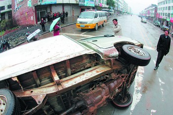 接讀者報(bào)料后,記者第一時(shí)間趕到沙市鎮(zhèn)事發(fā)現(xiàn)場(chǎng)。在書院路與建文路的交叉口斑馬線上,側(cè)翻著一輛小貨車。盡管一直下著毛毛細(xì)雨,但小貨車駕駛室窗口邊一米長(zhǎng)的血跡還明晰可見。當(dāng)?shù)鼐用裰阜Q肇事車是瀏陽(yáng)市交通局沙市交管站的執(zhí)法車,停在10多米遠(yuǎn)的地方,牌號(hào)是湘A8F905,執(zhí)法車左側(cè)中間有被撞的印跡,車頭對(duì)著倒地的小貨車。