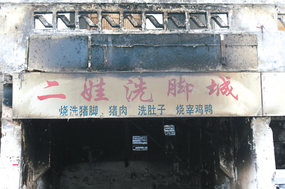 昨日,記者在九坑子農(nóng)貿(mào)市場(chǎng)中找到了這家“最牛洗腳城”,由于該地段即將拆遷,該店鋪內(nèi)早已空無(wú)一人,但“二娃洗腳城”的招牌依然高掛在這家僅10平米大小的店門前,在這片凌亂的地方,顯得十分醒目。