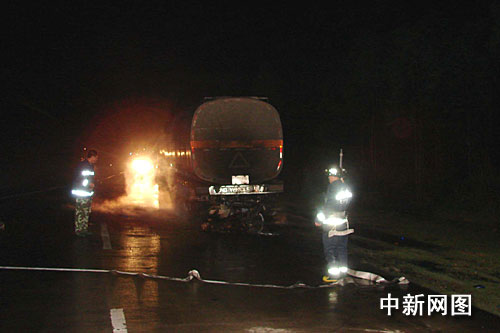 消防官兵隨后用兩支水槍進(jìn)行滅火。幾分鐘后,大火被撲滅。消防官兵檢查發(fā)現(xiàn)摩托車手已在大火中喪生,姿勢(shì)猙獰,摩托車已在大火中燒毀。為防止復(fù)燃,消防官兵又用一支水槍對(duì)罐體、車身降溫。完