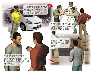 檢察官劉毅稱,當時李某是開車去的,被圍觀群眾記下了車牌號,警方據(jù)此將他抓獲。曾、張二人得知李某被抓,商量由張某獨自扛下此事,并統(tǒng)一口徑“曾某不在打人現(xiàn)場,只有張一人動了手!