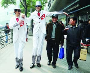 提起這兩個(gè)小伙子,南京市民可能并不陌生。2米26的那個(gè)叫張夢(mèng)永,2米12的叫秦為超,快報(bào)曾經(jīng)報(bào)道過他倆的“雙塔組合”。昨天下午兩點(diǎn),兩“巨人”出現(xiàn)在山西路上,穿著定制的白色禮服,戴著高高的白色禮帽,再配上酷酷的墨鏡,所經(jīng)之處立刻被圍得水泄不通!巴,你有姚明高么?”“你們的腿是真的假的。俊薄斑@么大腳,是真的么?”圍觀的市民們提出千奇百怪的問題,兩個(gè)小伙子耐心地一一解答。