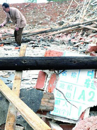 上午10時許,記者在爆炸現(xiàn)場看到,一個6平方米的火藥中轉車間已被夷為平地,瓦礫堆上散落著幾個燒焦的藥桶,附近的樹枝上掛著瓦礫碎片。所幸的是,距中轉車間20多米外的一個制造車間未受殃及,里面的工人安然無恙。