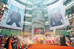 昨日上午11時(shí),渝北照母山龍湖東海酒樓,五層樓房被禮炮和彩色氣球包裹,兩幅10多米長(zhǎng)的巨幅海報(bào)從五樓垂到底樓,私家車(chē)在酒樓前的馬路上綿延停放了數(shù)百米。除了喜慶的管弦樂(lè)隊(duì)演奏外,印有“祝劉梁先生生日快樂(lè)”字樣的滑翔機(jī),也在酒樓上空不斷盤(pán)旋。