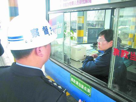 昨日上午10時(shí)30分,記者趕到京珠高速鄭新段的圃田收費(fèi)站。鄭州市公安局與鄭東新區(qū)公安分局的3名督察民警詢問(wèn)一名收費(fèi)站的工作人員,該工作人員身穿深藍(lán)色制服,帽徽、肩章、臂章、胸牌、紐扣等多處與“99”式警服相仿。“就這身打扮,誰(shuí)知道他們是不是真警察!”現(xiàn)場(chǎng)圍觀的一名群眾說(shuō)。該工作人員透露,他們的制服是2008年12月統(tǒng)一換發(fā)的,全省200多個(gè)收費(fèi)點(diǎn),所有工作人員穿的都是這種統(tǒng)一的制服,他們并不知道這是違規(guī)的。