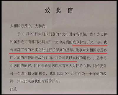 在電視廣告中,玖玖理療褲被吹的神乎其神,說能包治百病,各種疑難雜癥不在話下,那么,在這種神奇的背后,玖玖理療褲究竟隱藏著怎樣的秘密呢?我們從商場了解到,很多消費者看了前面的廣告之后,不僅買了理療褲,還為了得到一張由河南開封大相國寺高僧開光的玖玖護寶,寧可再多掏20塊錢,再買一件玖玖背心,開封大相國寺是著名的佛教圣地,這里的高僧真的會為推銷玖玖理療褲而走進廣告嗎?一起來來看看事情的真相。