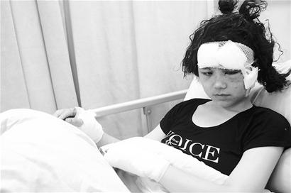 昨日上午9點(diǎn)半,在華西醫(yī)院急診科,馮曉蘭的兩名女同學(xué)正為她打理頭發(fā)。被鮮血浸透,頭發(fā)凝結(jié)成了一塊,根本無法梳理。經(jīng)過幾天的治療,馮曉蘭的傷勢(shì)已明顯好轉(zhuǎn),但紅腫的雙眼及面部的瘀痕依然清晰可見,緊裹紗布的雙手至今還不能動(dòng)彈。她說,由于身體還處在恢復(fù)期,這些天來,起居都是由同學(xué)輪流照顧。
