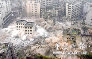 “5、4、3、2、1,爆破!”8點(diǎn)整,在總指揮的命令下,只聽見一聲巨響,6棟樓同時(shí)轟然倒下,眨眼工夫就淹沒在濃煙中,僅用時(shí)1.5秒。隨即,消防車開始噴水控制揚(yáng)塵。
