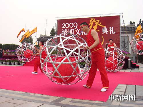 震撼的鐘鼓聲,以象征中華民族傳統(tǒng)中最高禮數(shù)的數(shù)字拉開文化祭祀的序幕;清婉的樂聲中,配以渾厚的嗓音朗誦祭文,表演滾燈的八名小伙則身著紅色演出服手持近一人高的滾燈登場。最令人意外的是,紅色成為這場祭祀的主打色彩——紅毯、紅漆大鼓、紅色的滾燈,表演者的頸上也都戴著一條絳紅色的圍巾,現(xiàn)場形成了一股中國民俗濃烈的傳統(tǒng)文化氣氛。