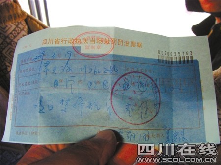 19日上午10時(shí)許,仁壽縣城區(qū)書(shū)院街,倪師傅正騎著新買(mǎi)的三輪車(chē)。一輛沒(méi)有牌照的長(zhǎng)安之星警車(chē),突然停在他面前,從車(chē)上下來(lái)兩個(gè)身著交警協(xié)警員制服的男子:“你的車(chē)不能進(jìn)城,過(guò)來(lái)接受處理!蹦邘煾到忉屨f(shuō):“警官,我是來(lái)給車(chē)上牌照的,交警大隊(duì)在城里,我必須進(jìn)城啊!薄吧僬f(shuō)這些,違反了規(guī)定就要罰款。本來(lái)罰200元,念你是初犯,交100元就是了!彪S即,坐在該車(chē)駕駛室里的一名身著交警制服的中年男子開(kāi)了一張100元的罰款單據(jù),倪師傅最終只得無(wú)奈地交了罰款。