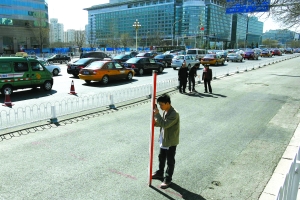 昨日12時許,西單文化廣場前的長安街非機(jī)動車道兩頭出入口,已經(jīng)被拉上警戒線,交警及協(xié)管員指揮過往非機(jī)動車,由廣場人行道繞行。警戒線內(nèi),非機(jī)動車道上一面積近40平方米的路面輕微凹陷,形成一個明顯但弧度不大的低洼處。柏油路面上,工作人員用噴漆標(biāo)記了沉降范圍,以及需要進(jìn)行勘測的監(jiān)測點。